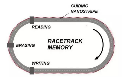赛道存储器的概念示意图:磁性物体从读元件移动到写元件